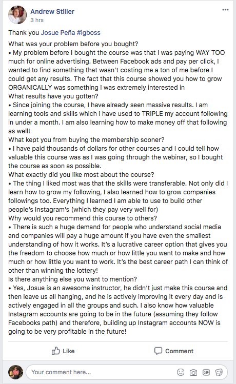 Simply put, IG Boss is a program that shows you the fastest way to monetize your passion, improve your influence, and increase your income, using IG.